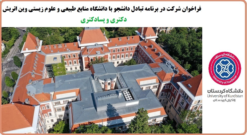 مدیریت امور بین‌الملل دانشگاه کردستان در نظر دارد دانشجویان دکتری و پژوهشگران پسادکتری واجد شرایط را در قالب برنامه تبادل دانشجو/ پژوهشگر برای ترم تحصیلی پاییز ۱۴۰2 به دانشگاه منابع طبیعی و علوم زیستی وین (University of Natural Resources and Life Sciences, Vienna (BOKU)) اعزام نماید. این برنامه تحت حمایت مالی گرنت اتریشی ERNST MACH Grant  قرار دارد و به دانشجویان دکتری/ پژوهشگران پسادکتری که موفق به دریافت گرنت ‌شوند علاوه بر تامین هزینه‌های سفر رفت و برگشت، ماهیانه مبلغ  ۱۰۵۰ الی 1150 یورو برای پوشش هزینه‌­های زندگی به مدت یک ترم تحصیلی (حداکثر تا 9 ماه) پرداخت خواهد شد.