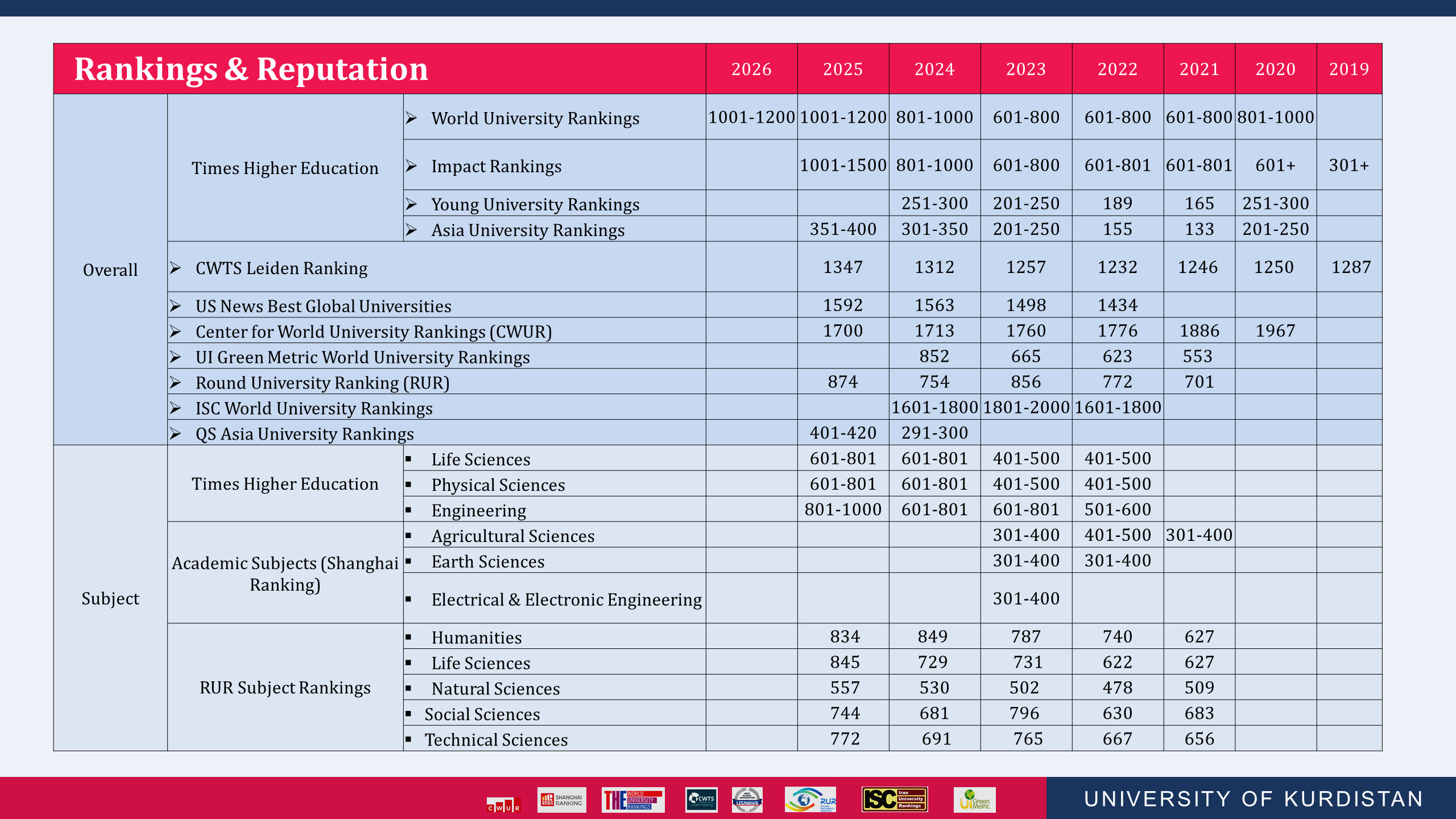 دانشگاه کردستان در نظامهای رتبهبندی